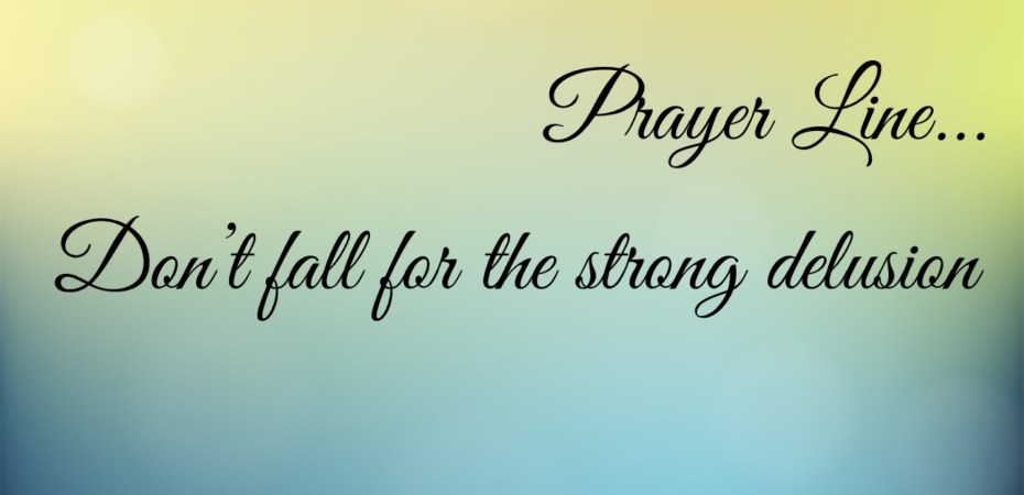 Good morning! I Love the Prayerline! God knows what we need when we need it! We discussed “Dont fall for the Strong Delusion” 2 Thessalonians 2:1-12; John 8:42-47; 2 Peter 2:21. “For this cause God shall send them Strong Delusion” Wow! God will send a Strong Delusion. A “strong delusion ” is an effectual inward working of error in our hearts. This inward error is sent “with a view to many believing the lie.” the lie; that is which Antichrist would have believe. Righteousness is still right! Many of us as believers; not the sinners; but the Believers, will be sent a strong delusion from God not Satan, because many love error more then the Truth. There are people who wants the spot light instead of being the Light. People rather hear about being rich then hearing how to truly please God, there are People who rather beleive the Prophecy coming from the mouth of man that tells them they going to get married to the man of their dreams, instead of believing that God is all that they need and in time he will supply what you need according to his riches and glory for you. In 2 Timothy 4:3-4″ for the time will come when people will not put up with sound Doctrine instead, to suit their own desires, they will gather around them a great number of teachers to say what their itching ears want to hear. They will turn their ears away from the truth and turn aside to myths.” Such people open their ears to any teacher who will relieve their particular “itch” regardless of how it measures against the truth. Believers, Saints of God, Please Wake up! “Beloved, do not believe every spirit, but test the spirits, whether they are of God; because many false prophets have gone out into the world” 1John 4:1. Stop living a lie or believing a lie! Line your heart up with your Gods word and speak the word against these false delusions. Be that Believer that God is controling every part of your life, that other sinner will be drawn to the light. Stay true! Dont fall for the Strong Delusion!
